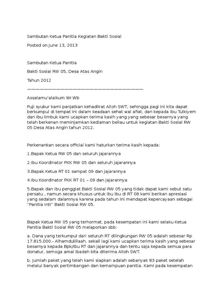 Hasil survey diterbitkan untuk mencari dana dana bisa dari online maupun offline. Sambutan Ketua Pelaksana Acara Baksos Pdf Download All Access to Sambutan Ketua Pelaksana Acara Baksos PDF. Acara berikutnya yaitu pembagian sembako kepada penduduk yang dianggap.