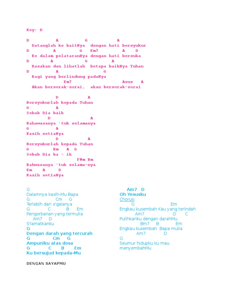 Sbab rahmatMu baru stiap pagi. Bersyukurlah Haleluya Ku MemujiMu Tuhan Chord - Bersyukurlah kepada TUHAN Sbab IA baik sbab IA baik Bahwasanya untuk selamanya Kasih setiaNYA. D Fm Datanglah Ke BaitNya G A Dengan Hati Bersyukur D Fm Ke Dalam PelataranNya G Em A D Dengan Hati Bersuka D Fm Rasakan Dan Lihatlah G A Betapa Baiknya Tuhan D Bagi Yang Fm Berlindung Padanya G Em Akan Bersorak Sorai A Akan Bersorak Sorai Reff.