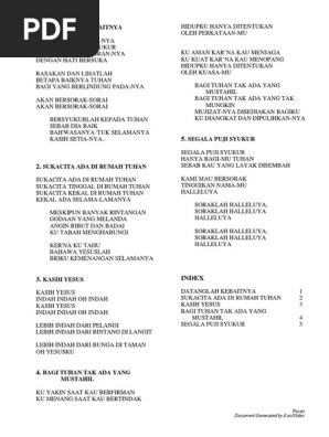 G D Haleluya Kumemuji-Mu Tuhan Em C Karna Kasih-Mu Tak Berkesudahan G D Biar Yang Bernapas Memuji Sang Raja F D Di Atas Gunung Dan Di Dalam Samudera C G Tanganku Kuangkat Pada-Mu Bm C GB Mensyukuri Rahmat Yang Kau Bri C G Kakiku Melompat Bagi-Mu Am D C D Sbab Rahmat-Mu Baru Setiap Pagi Reff. D A Datanglah ke bait-Nya G A Dengan hati bersyukur D A Ke dalam pelataran-Nya G A Dengan hati bersuka D A Rasakan dan lihatlah G A Betapa baiknya Tuhan D A G Bagi yang berlindung pada-Nya Em Akan bersorak-sorai A Akan bersorak-sorai Chorus. A dengan hati B bersyukur.