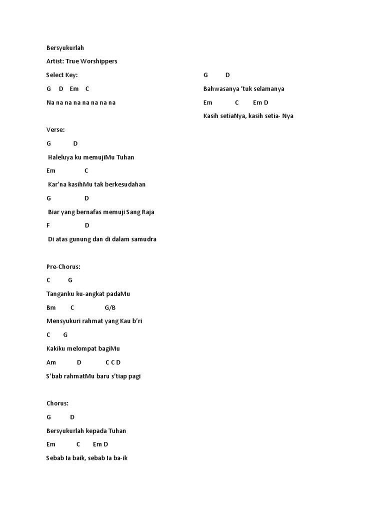 Chord Bersyukurlah True Worshippers Transpose. Lirik PS-831 BERSYUKURLAH KEPADA TUHAN Syair dan lagu. D A Bersyukurlah kepada Tuhan G A Sebab Dia baik G D Bahwasanya tuk selamanya Em A Kasih setia.