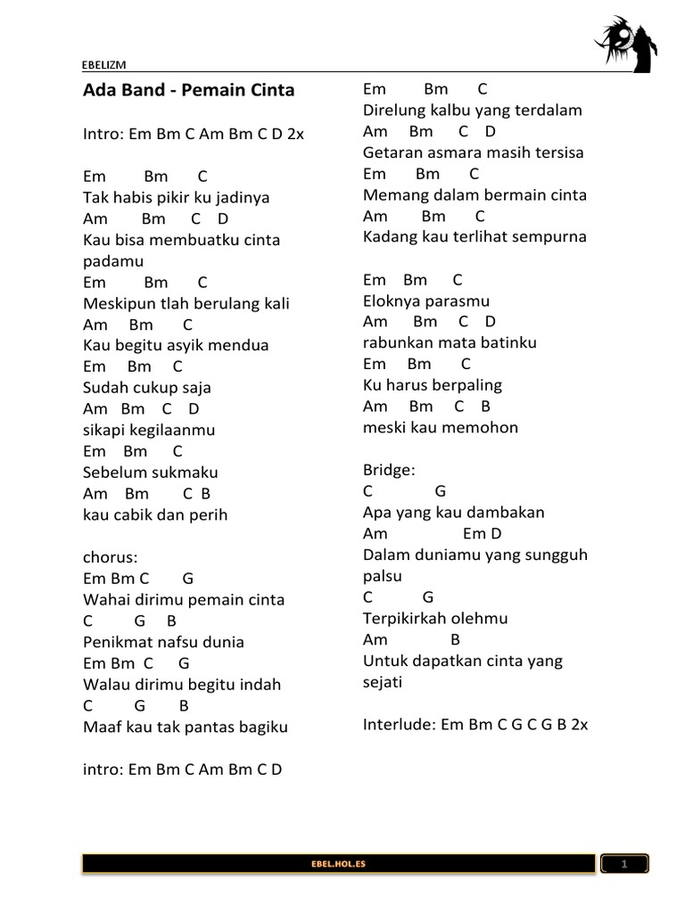 CHORDS USED Em C D B G E A Fm Em Em mataku Terpana Pesona Wajahmu Em Em merajah Sela Tubuhku C melintas Dengan Gemulai D Em merangsang Angan Bercinta Em B Jala Dihati Terbentang Emosi C D Kuberkhayal Berdua Lepas Tegangan Yang Ada C D Em Dalam Birahi Terpendam Kuyakin.