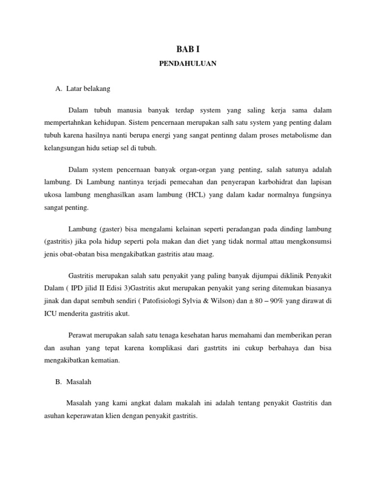 Gastritis adalah suatu keadaan peradangan atau perdarahan mukosa lambung yang dapat bersifat akut kronis difus atau lokal Price 2005Gastritis daalah peradangan lokal atau penyebaran pada mukosa lambung dan berkembang dipenuhi bakteri Charlene 2001Gastritis akut adalah inflamasi mukosa lambung sering diakibatkan dari pola diet yang tidak baikSedangkan gastritis. Nyeri ulu hati Anamnesis Terpimpin Nyeri ulu hati dirasakan sejak. 04 Februari 1961 Umur.