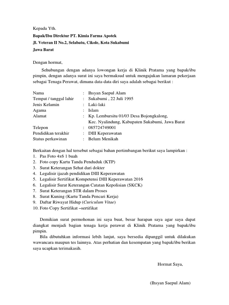 Tag - Membuat Surat Sehat di Kimia Farma Idjen. WA 0811-1816-800 asisten kesehatan ProSehat untuk keluarga Indonesia. Contoh surat lamaran kerja kimia farma versi 2 Semarang 1 januari 2018 Hal.