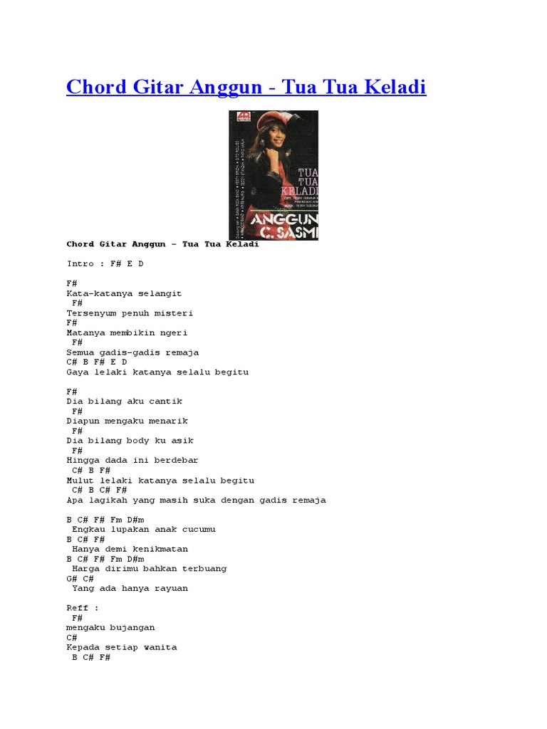 Here I will breakdown solo from one of the. Chord Tua Tua Keladi Anggun C Sasmi. C G D Kata-katanya selangit D Tersenyum penuh misteri D Matanya membikin ngeri D Semua gadis-gadis remaja A G D C G Gaya lelaki katanya selalu begitu D Dia bilang aku cantik D Diapun mengaku menarik D Dia bilang body ku asik D Hingga dada ini deg degan A G D Mulut lelaki katanya selalu.